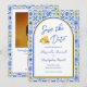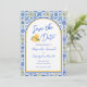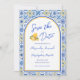 Destination wedding save the date with QR code featuring Italian blue white yellow tiles and a trendy chic arch inspired by a Mediterranean summer in Positano on the Amalfi Coast. Elegant script typography and watercolor lemon gelato details create a stylish, romantic design perfect for a timeless European or coastal celebration. Please contact me if you have any requests for custom products.