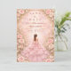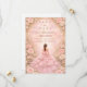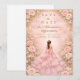 Este elegante diseño de quinceañera presenta un suave fondo de acuarela rosada enmarcado por rosas románticas, flores delicadas y sutiles acentos dorados, con una ilustración de vestido elegante que crea una atmósfera soñadora y refinada. La paleta de tonos pastel rosados y los detalles florales dan al diseño un toque lujoso y juvenil, lo que lo hace perfecto para una celebración clásica de quinceañera con un estilo romántico inspirado en el jardín.