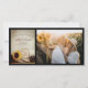 Fije el tono para sus nupcias de temática de bosque encantado al aire libre con la encantadora Boda Rústica de los bosques de girasol Guardar la tarjeta fotográfica de fecha. Personalízalo con los nombres de la pareja, la fecha del boda y la foto. Este personalizado de moda de campo, de madera de inspo, conserva las fechas con una pintoresca fotografía floral de una flor de girasol amarillo, conos de pino marrón y rodajas de madera natural con un velo de novia blanco y fondo de satén blanco.