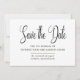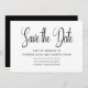 Elegante y atemporal diseño blanco y negro. Guardar la fecha se escribe en un texto de script hermoso. A continuación se indican sus nombres, fecha de boda y ubicación. Puede incluir un mensaje adicional en la parte posterior.