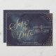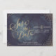Diseño de caligrafía con letras de oro y puntos dorados en el fondo del agua del cielo marino oscuro, efecto purpurina de oro metálico de imitación, moderno, moda, elegante y elegante, perfecto para bodas vintage o bodas de invierno por la noche. Personalizado tu propia tarjeta de fecha para tu juego de invitación de boda. Vea todas las piezas que coinciden en esta colección de caligrafía de purpurina dorado Glam night a continuación.