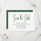 Elegante y atemporal diseño de caza verde y blanco. Guardar la fecha se escribe en un texto de script hermoso. A continuación se indican sus nombres, fecha de boda y ubicación. Puede incluir un mensaje adicional en la parte posterior.