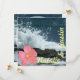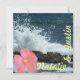 La playa tropical salva la fecha con olas que salpican contra la orilla, hibiscos de coral rosa y divertidos textos en negrita. La forma perfecta de anunciar una próxima boda de destino junto al mar.
