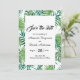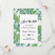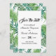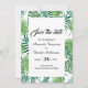 Una elegante vegetación tropical llena de flores permite guardar la fecha para una tarjeta boda. Plantillas para nombres y fecha de boda. Un elegante fondo blanco, letras negras. Hojas de palmera verde acuático y follaje como marco. Atrás: el mismo fondo que el marco de la parte delantera.