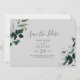 Este gris de esmeralda verde horizontal ahorra la tarjeta de fecha es perfecta para un boda boho. El diseño es elegante y rústico, con unas hojas de acuarela verde oscuro y un eucalipto con un toque bohemio moderno.