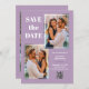 Estas modernas y elegantes bodas de lavanda ahorran las tarjetas de cita con tres fotos de la pareja, además de texto en negrita y blanco sobre un fondo morado claro. Añade tu código QR para tu sitio web boda o para que los invitados lo hagan en línea.