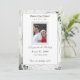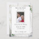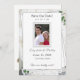 White Lace y Rosa Sale de Boda Guardar la fecha en el diseño muestra la foto enmarcada en el centro con la información mostrada contra un respaldo blanco. El fondo muestra la imagen de encaje blanco. Las hojas de rosa verdes se colocan delicadamente en las esquinas. El reverso presenta un fondo blanco con un solo rosa sepia que se muestra en la esquina inferior derecha.