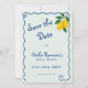 ¡Anuncia tu día especial con encanto mediterráneo! Esta invitación de "Save the Date" de inspiración italiana presenta un fondo suave de color azul claro enmarcado por un borde de azul cobalto caprichoso con giros juguetones a lo largo de la parte superior, izquierda y derecha. Una rama de limón vibrante añade un toque alegre y romántico, que evoca el sol y el estilo de la Costa Amalfitana.