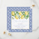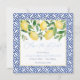 Los limones acuarelas y las flores delicadas se complementan con un borde de azulejos cobalto azul y blanco y el patrón inverso en estas tarjetas Save The Date.