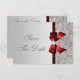 Elegantes tarjetas de invitación de boda personalizadas en plata y rojo "Save the Date" con una hermosa imagen impresa con patrón de lentejuelas plateadas, un lazo y cinta impreso en rojo brillante y un diamante impreso con brillo de joya. Estas invitaciones elegantes, glamurosas y de moda están decoradas en ambos lados. Hermosas invitaciones chic, modernas y de moda. Tenga en cuenta: todas las invitaciones en Zazzle tienen imágenes impresas planas. El texto, la fuente y el color de la fuente se pueden personalizar. Si necesita ayuda para personalizar su producto, por favor contácteme a través de mi tienda. Estaré encantado de ayudar. Tengo productos que combinan en mi tienda.