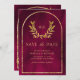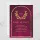 Sorprenda a sus invitados con esta elegante boda Salven la fecha con una hermosa rama de hojas de oro. Simplemente agregue los detalles de su evento en esta plantilla fácil de usar y adorne esta tarjeta con su foto favorita para convertirla en una tarjeta de guardar la fecha.