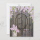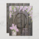 Esta hermosa tarjeta de guardar la fecha de la boda presenta tu foto rodeada de lilas primaverales con luces blancas sobre un fondo de madera de granero envejecida. El texto es de un color lavanda pálido o púrpura claro. Hermoso para una ceremonia rústica en el patio trasero o al aire libre.