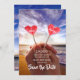 Personalizar la llama gemela salva la fecha con forma de corazón adorable. Lolipops contra una bella escena de playa con las palabras "Le pregunté" y "Dije sí"