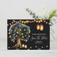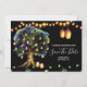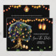 Una maravillosa y vibrante ilustración que presenta un gran roble lleno de faroles colgantes brillantes falsos y luces de cuerda sobre un fondo negro de medianoche. El borde superior e inferior tienen cestas ovaladas de mimbre que se iluminan contra el cielo nocturno. Pequeñas hojas verdes están esparcidas debajo del árbol y plantillas blancas aparecen a la derecha del mismo para tus detalles personalizados. Estos son ideales para anuncios rústicos de "save the date" de otoño, verano, primavera o invierno en el campo. Estas tarjetas planas lujosas y elegantes delatarán a tus invitados.