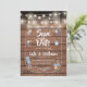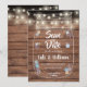 Cuenta con luces de cuerda sobre un frasco de mason artístico lleno de detalles personalizados de aviso de fecha de salvación y flores delicadas dispersas sobre un fondo de paneles de madera rústica. Diseñado por Thisisnotme©