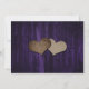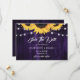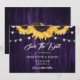 Tarjeta de aviso de boda floral morada y amarilla rústica con flores de girasol y luces de cuerda sobre un fondo de madera rústica.