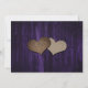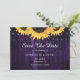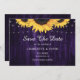 Tarjeta de aviso de boda floral morada y amarilla rústica con flores de girasol y luces de cuerda sobre un fondo de madera rústica.