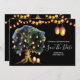 Una maravillosa y vibrante ilustración que presenta un gran roble lleno de faroles colgantes brillantes falsos y luces de cuerda colocados sobre un color de fondo de su elección. El borde superior e inferior tienen cestas ovaladas de mimbre que se iluminan contra el fondo dorado. Pequeñas hojas verdes están esparcidas debajo del árbol y plantillas blancas aparecen a la derecha del mismo para sus detalles personalizados. Estos son ideales para anuncios rústicos de "save the date" de otoño, verano, primavera o invierno. Estas tarjetas planas lujosas y elegantes encantarán a sus invitados.