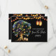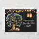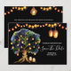 Una maravillosa y vibrante ilustración que presenta un gran roble lleno de faroles colgantes brillantes falsos y luces de cuerda colocados sobre un color de fondo de su elección. El borde superior e inferior tienen cestas ovaladas de mimbre de rattán que están iluminadas contra el fondo dorado. Pequeñas hojas verdes están esparcidas debajo del árbol y plantillas blancas aparecen a la derecha del mismo para sus detalles personalizados. Estos son ideales para anuncios rústicos de "guarde la fecha" de otoño, verano, primavera o invierno. Estas tarjetas planas lujosas y elegantes encantarán a sus invitados.