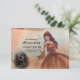 Prepare el escenario para una celebración glamurosa con esta Tarjeta de "Save the Date" para Quinceañera de Lujo en Metalizado Cobre. Esta elegante tarjeta ofrece a los invitados una primera vista de la impresionante ilustración de un vestido de baile pintado a mano en cobre, acentuado con mariposas brillantes y detalles en dorado. Perfecta para anunciar su hito de alta costura, la parte trasera cuenta con un fondo negro sofisticado con un motivo de rosa brillante. Totalmente personalizable con su nombre, fecha y ubicación.