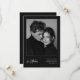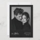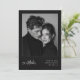 Featuring your favorite black-and-white engagement photo against a rich, dark background totally draws your friends and family in. It skips the bright colors and busy borders. Instead, it pairs a beautiful, elegant script for your wedding month with clean, modern text for your names and location. The whole layout gives off a sophisticated, "old money" vibe that feels completely classic but totally unique.