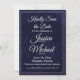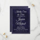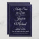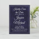 This elegant Save the Date card set features a rich navy blue textured background with refined white typography for a timeless and formal presentation. The front design uses graceful script lettering paired with classic serif text to highlight the couple’s names, wedding date, and location, while the wording style adds a traditional, sophisticated tone. The coordinating back showcases a clean monogram design framed by a double-line border, creating a polished and cohesive look. Ideal for formal, black-tie, and traditional weddings, this Save the Date design sets a refined tone for a classic wedding stationery suite.