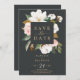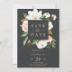 Este elegante negro magnolia, salvo la tarjeta de fecha, es perfecto para un boda moderno y elegante. El diseño floral húmedo incluye peonías color agua rosada, magníficas flores de magnolia blanca y algodón con hojas doradas y verdes en un arreglo lujoso sobre un fondo oscuro.