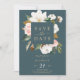 Esta elegante magnolia verde azulada, salvo la tarjeta de fecha, es perfecta para un boda moderno y elegante. El diseño floral húmedo incluye peonías color agua rosada, impresionantes flores de magnolia blanca y algodón con hojas doradas y verdes en un arreglo lujoso sobre un fondo verde azulado.