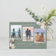 Boda temática del sur ahorra las tarjetas de fecha con tres plantillas de fotos. Flores de magnolias blancas y meridionales decoran las esquinas de las tarjetas horizontales de color gris-verde. Las plantillas de fotos están escalonadas con la izquierda un poco más alta que el centro y la foto derecha un poco más abajo. Las fotos de cada orientación funcionarán si el tema está en el centro. "Salven la fecha" en la parte superior, con nombres completos, fecha y ubicación del matrimonio en la parte inferior. Los colores coinciden con la colección de papel de magnolia del sur. Se muestra en las tarjetas de menor tamaño.