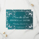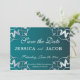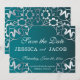 Plantilla personalizable de aviso de boda con marco de filigrana plateada recortada con láser sobre fondo degradado azul turquesa. El texto es totalmente personalizable.