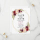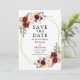 Elegante acuarela Borgoña Floral Guardar la tarjeta de Invitación Boda de fecha incluye rosas de color burdeos, rosas rosas rosas rosas, rosas rojas y vegetación en un marco geométrico dorado.