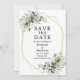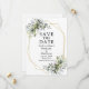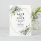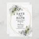 Moderna y elegante acuarela Verdor botánico Save The Date Card incluye hojas de eucalipto, follaje botánico verde, polvorientas hojas azules y otros hermosos paisajes botánicos. Marco Geométrico Oro.