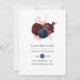 Invitación de boda vintage en azul marino, granate y oro rosa para guardar la fecha, diseñada para ser personalizada rápida y fácilmente según los detalles de su evento.