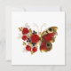 Mariposa de flores de los ojos de pavo real rojo con ala texturada roja, decorada con rosas rojos, pintados artistalmente con tallo dorado y hojas sobre fondo blanco.