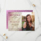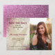 Anuncia tu gran día con elegancia y brillo utilizando esta tarjeta de Quinceañera para guardar la fecha. El lado izquierdo muestra una mariposa dorada brillante sobre un fondo rosa y con efecto de brillo con caligrafía moderna en color burdeos y negro. El lado derecho incluye una foto personal de la cumpleañera, lo que añade un toque emotivo y elegante. Totalmente personalizable con tu nombre, fecha y detalles, este diseño es perfecto para una celebración de Sweet 15 glamurosa y memorable.