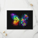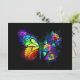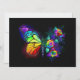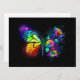 Arcoiris, mariposa monarca luminosa, pintada de forma artística con ramo de iridiscente, rosas brillantes y luminiscentes sobre fondo negro. Mariposa arcoiris.