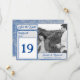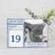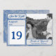 El diseño presenta un elegante efecto de mármol azul y gris como fondo para la foto y el texto. El texto incluye el título, "¡Guardar la fecha!", encima de la imagen de un Calander diario que muestra la fecha claramente. La foto se muestra a la derecha. A continuación se muestran los nombres de los futuros novios y bodas. Diseñado para coordinar con la "Suite Boda de mármol azul y gris".