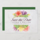 Esta elegante tarjeta de "save the date" floral presenta vibrantes flores con las palabras "save the date" en una fuente de moda, todo sobre un fondo de mármol pálido en la parte frontal y un dorso de color verde.