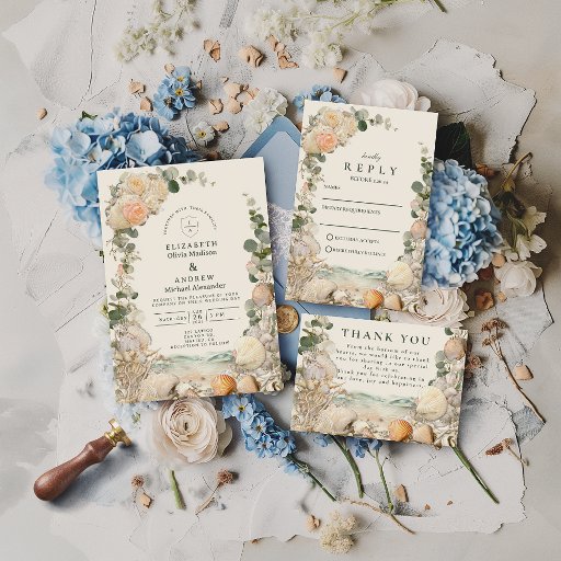 This romantic design draws inspiration from the Mediterranean coast, blending soft seashell details with muted botanicals and a vintage parchment background. Earthy neutrals, blush tones, and coastal textures create an old-world, seaside aesthetic that feels elegant, timeless, and effortlessly refined.