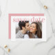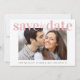 Un fresco y alegre salva la invitación del boda de fechas. "guardar la fecha" está escrito en la parte superior de tu foto de compromiso favorita en tipografía rosa rosa claro, limpio y moderno, y debajo puedes personalizar tus nombres, fecha de boda y ubicación. En el reverso, puede personalizar su información de guardar la fecha con más detalle en una tipografía blanca coordinada contra un fondo rosa claro y de color rosa.