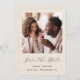 Esta sencilla y minimalista tarjeta Save the Date incluye una foto cuadrada encima de las palabras "Save the Date" en un elegante guión de escritura a mano en negro, seguido por los nombres de la pareja, la fecha boda y la ciudad en letra sans serif en un fondo beige. Añada un mensaje más detallado con información adicional sobre el reverso, junto con un código QR que envía invitados a su sitio web boda.