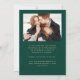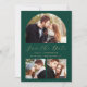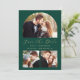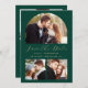 Esta sencilla y minimalista tarjeta Save the Date incluye un arco de fotos personalizado encima de las palabras "Save the Date" en un elegante guión de escritura a mano de color dorado, seguido por los nombres de la pareja, la fecha boda y la ciudad en letra sans serif en un fondo verde esmeralda. Dos fotos cuadradas más pequeñas aparecen en la parte inferior de la tarjeta. Añada una cuarta foto horizontal y un mensaje más detallado con información adicional en la parte posterior.
