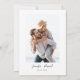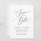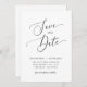 Moderna y mínima guardar la tarjeta de fecha con un guión elegante que dice "guardar la fecha" en el medio con la breve información del boda. Puede añadir una foto en la parte posterior.