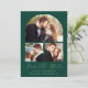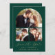 Esta sencilla y minimalista tarjeta Save the Date incluye un arco de collage de 3 fotos encima de las palabras "Save the Date" en un elegante guión de escritura a mano de color dorado, seguido por los nombres de la pareja, la fecha boda y la ciudad en letra sans serif en un fondo verde esmeralda. Añada un mensaje más detallado con información adicional sobre la marcha atrás.