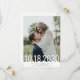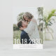 Tarjeta vertical de 5x7 para guardar la fecha de la boda con un diseño de tipografía simple y moderno con una fecha en fuente grande y delgada superpuesta sobre su foto que se carga en la plantilla y se escriben sus nombres y la ubicación y fecha de la boda para un diseño rápido y fácil que funcionará con el tema que elija más adelante. Los colores de fondo y las fuentes son editables para que coincidan con su esquema de color, y puede agregar más información o fotos adicionales en el reverso.