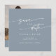 Esta foto polvorienta moda azul polvorienta cuadrada de vuelta ahorra la tarjeta de fecha es perfecta para un boda minimalista. El diseño moderno y moderno de estilo bohemio azul claro neutro presenta una caligrafía rústica sencilla con un estilo único y clásico. Personalice su fecha de guardar con sus nombres, fecha de boda, ubicación, foto de compromiso y dirección del sitio web de su boda.