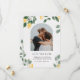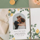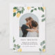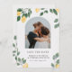 Invite a su familia y amigos a celebrar a su boda con este tema de verano de moda de este país con el tema de limón Save the Date Card. El diseño presenta una imagen de la pareja feliz enmarcada en un arco, un fondo texturado con hermosos limones cítricos, flores de flores de flores blancas y follaje verde pintado a mano.