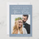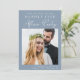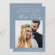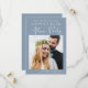 azul polvoriento de la moda salve el anuncio de la fecha de su post-salida o la recepción de boda privada o fiesta de celebración. La parte delantera incluye la foto de su boda y "Save The Date For Our Happy Ever After Fiesta" en una mezcla de tipografía blanca simple y un guión blanco moderno. Bajo su foto, agregue sus nombres y fecha de boda. Al revés, personaliza el mensaje de fecha y agrega los nombres en un script similar a la firma.
