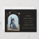 La Moda mística Black Gold Sun Moon Star Space Save The Dates presenta un marco dorado de sol, luna y estrellas sobre un elegante fondo negro. Adentro está tu foto favorita y tu personalizado guarda la información de la fecha. Personalice editando el texto en los cuadros de texto. Diseñado por ©Evco Studio www.zazzle.com/store/evcostudio