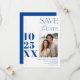 Esta moderna tarjeta de fecha guarda un diseño elegante y minimalista, perfecto para parejas que aman una estética limpia y sofisticada. La tarjeta muestra de forma destacada la fecha boda en tipografía en negrita y grande en el lado izquierdo, asegurando que la fecha sobresale y sea fácilmente notada. En el lado derecho, hay un espacio dedicado a la foto de la pareja, añadiendo un toque personal a la invitación. El texto está ordenado de forma elegante en un estilo contemporáneo, manteniendo el foco en detalles esenciales como los nombres de la pareja, la fecha boda y la ubicación. El azul y el blanco retro crean un ambiente atemporal, lo que hace de esta carta una elección elegante para cualquier boda moderno.